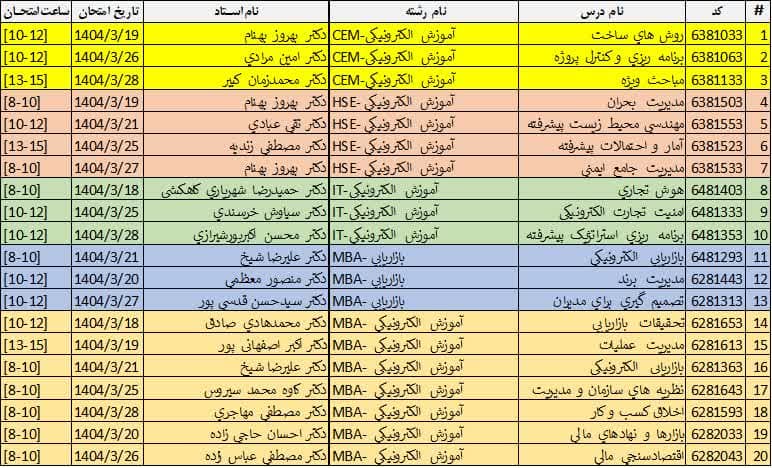 با توجه به الزام دانشگاه به صرفهجویی در مصرف برق و پیرو مصوبه هیئت رئیسه دانشگاه مورخ 23/02/1404 مقرر گرديده است كه كليه امتحانات پايان ترم نيم سال دوم 1403 تا حد امكان تا قبل از ظهر پايان يابد، لذا برنامه امتحانات با توجه به تغييرات ساعت برگزاري به پيوست ارسال مي گردد. لازم به ذكر است در تاريخ (روز) برگزاري امتحانات تغييري بوجود نيامده است. خواهشمند است دانشجويان برنامه ريزي مناسبي جهت حضور در جلسات امتحان انجام دهند. همچنين به اطلاع مي رساند امتحانات پايان ترم در تهران – دانشگاه صنعتي اميركبير برگزار مي شود و مكان برگزاري امتحانات در دانشگاه متعاقبا اعلام خواهد شد.